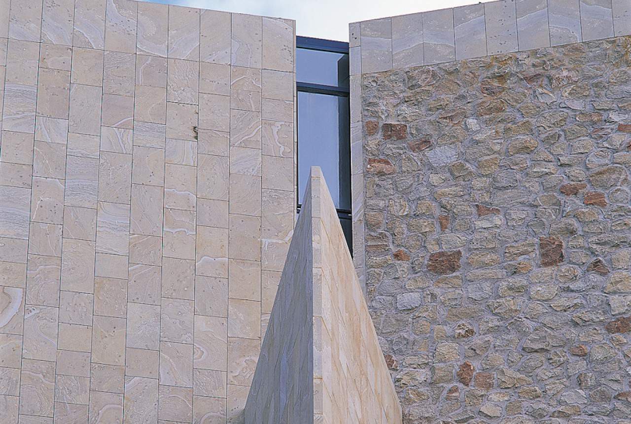 Torres, muros de mampostería, un salpicado de ventanas cuadradas, todo ello levantado sobre un zócalo rocoso, confirman la inicial concepción de fortaleza, pensada, además, para ser colocada sobre una superficie proyectada como un jardín de dunas, de cráteres de piedra volcánica que protegen la vegetación del agresivo viento marino, de forma similar a lo que han venido haciendo los agricultores de la isla durante siglos, solo que aquí no son circulares, sino triángulos apuntando hacia el mar.