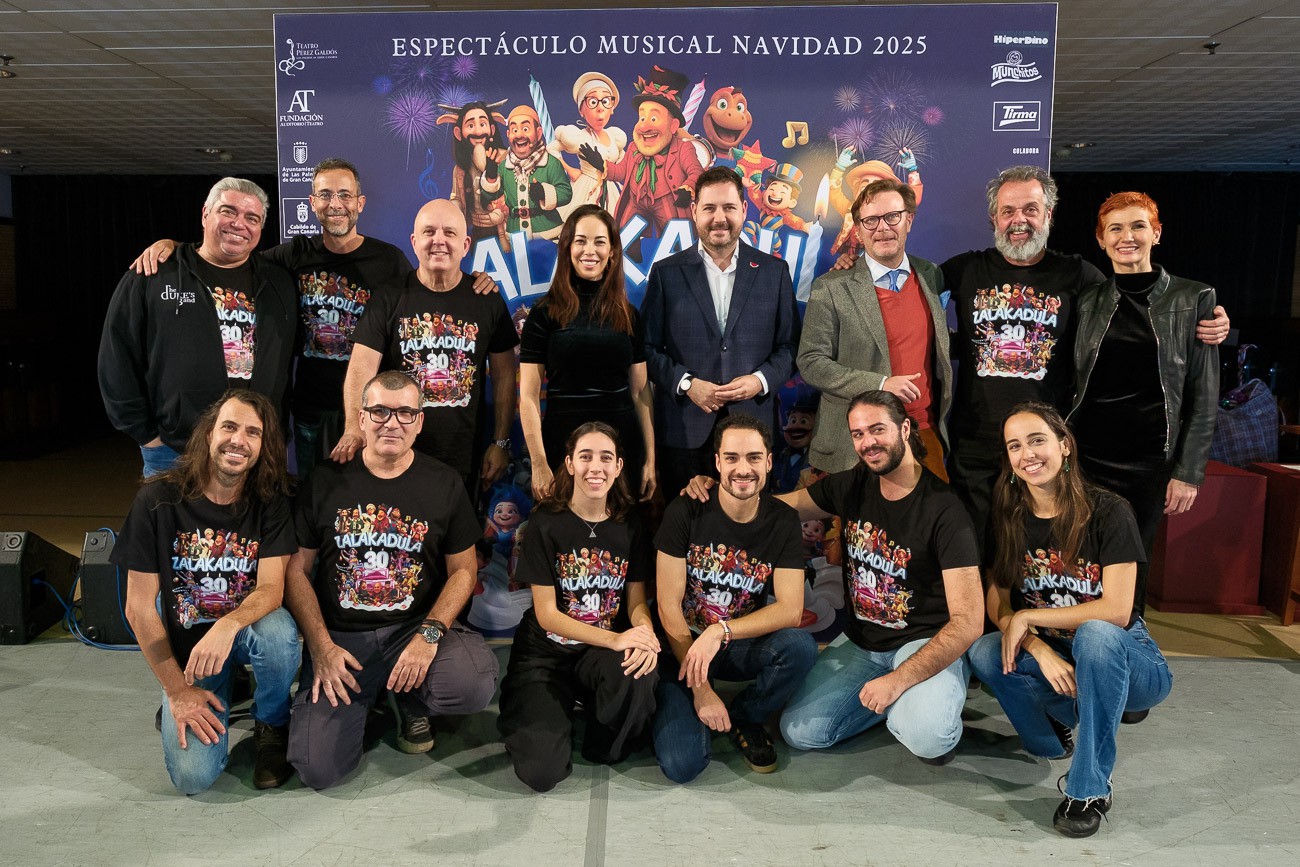 Antonio Lorenzo señaló que la presentación debía entenderse como una celebración de los 30 años de Zalakadula, “un proyecto que ha crecido junto a su público y que hoy reúne en el teatro a varias generaciones de una misma familia”. Destacó la vigencia del espectáculo, su capacidad de relevo generacional tanto sobre el escenario como entre el público, y recordó a figuras clave de su historia, como José Antonio Ramos y Toñín Barrera, dueño del Cuasquías, cuyo impulso fue decisivo en los orígenes del proyecto. El director artístico de Zalakadula, Luifer subrayó que Zalakadula es fruto del talento colectivo de numerosos artistas, “el objetivo sigue siendo crear un espacio de diversión, emoción y esperanza donde padres, madres, hijos e incluso abuelos puedan reconocerse y celebrar juntos Es maravilloso ver a padres y abuelos que vinieron hace tres décadas con sus hijos y ahora traen a sus nietos” Por su parte Guacimara Medina recordó “yo fui una de esas niñas que venía a ver Zalakaduala con los ojos como platos y que ahora vengo con mis hijas”. Definió Zalakadula como una cita imprescindible de la Navidad, capaz de “diseñar sonrisas” y mantener vivo un ritual familiar que se repite año tras año, con el respaldo del Cabildo de Gran Canaria. Finalmente, Josué Iñiguez destacó que Zalakadula es un ejemplo del valor cultural de Las Palmas de Gran Canaria, en un momento tan importante como el que se está viviendo a la hora de posicionarse como Capital Europea de la Cultura 2031, “un proyecto auténtico que demuestra la fortaleza de la cultura hecha en esta ciudad”, afirmó.